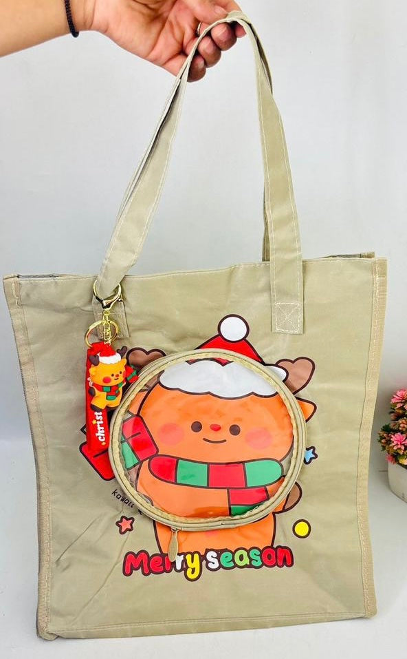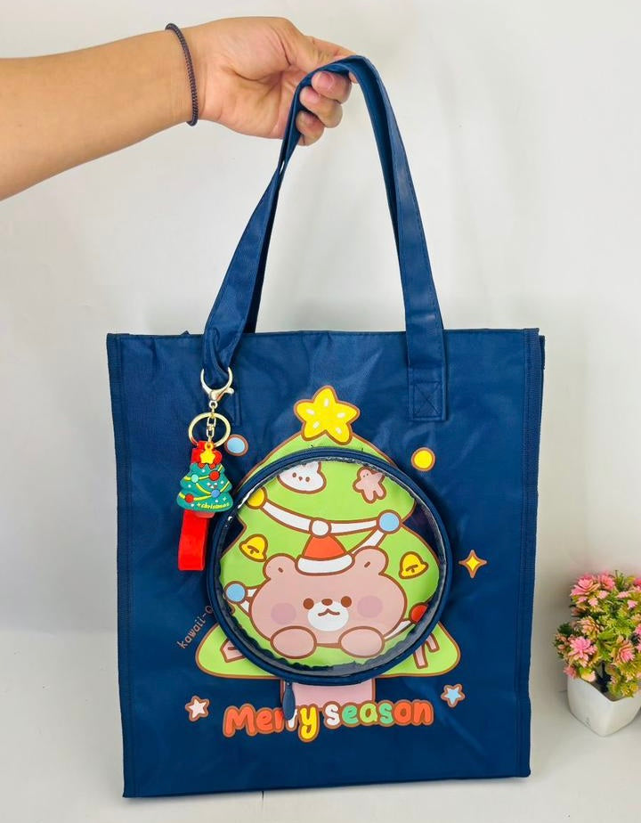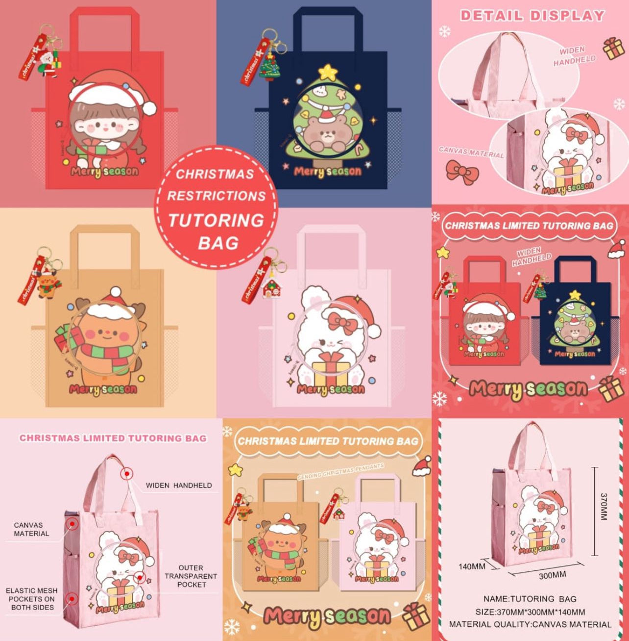 Festive Design: The bag features a vibrant and joyful Christmas-themed design that includes iconic holiday elements such as Santa Claus, reindeer, snowflakes, and presents.