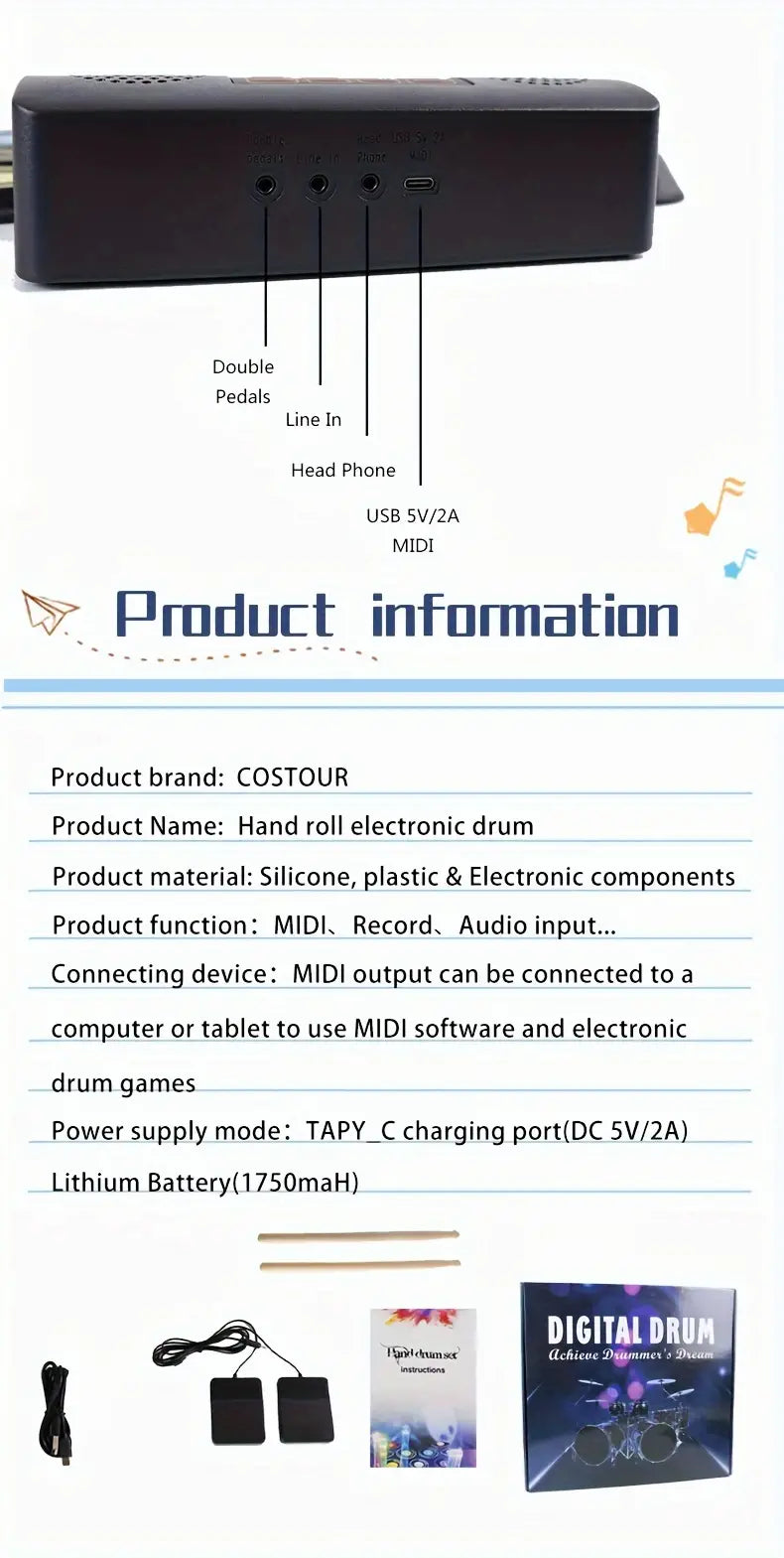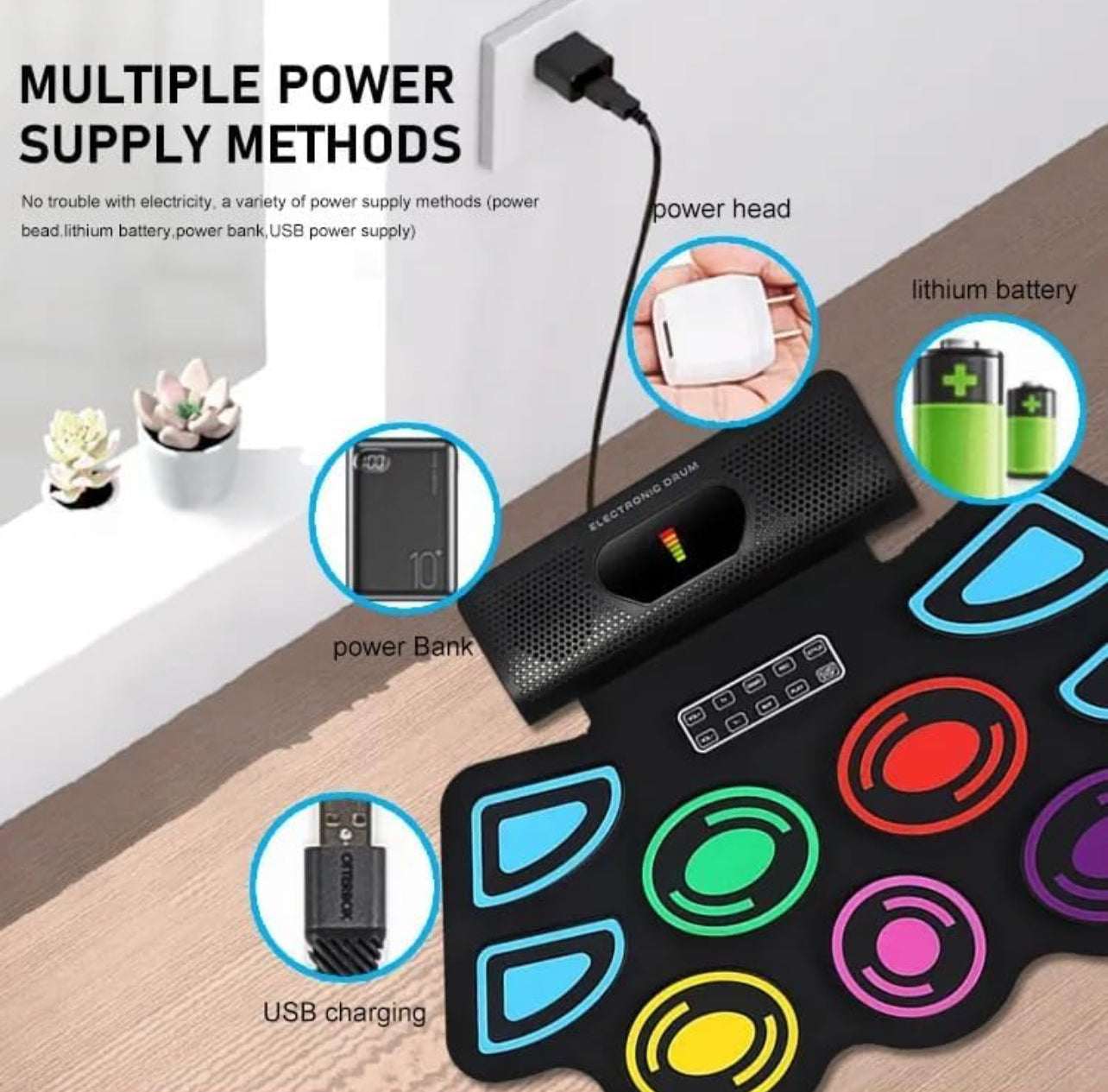 - All-Inclusive Drumming Package: This kit has everything you need to get started: a roll-up drum mat, USB cable, audio cable, two foot pedals, and two high-quality wooden drumsticks. Power it up with either 2 x AAA Batteries (not included) or a 5V USB 'B' cable (included).
