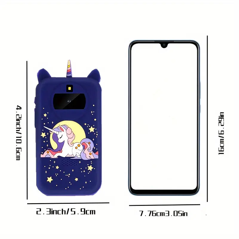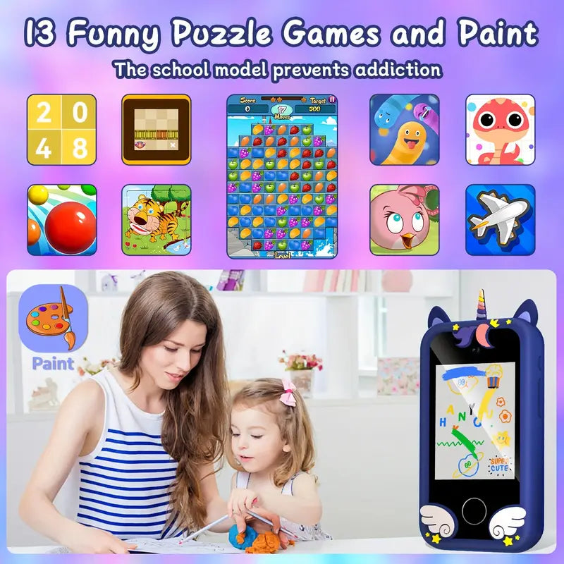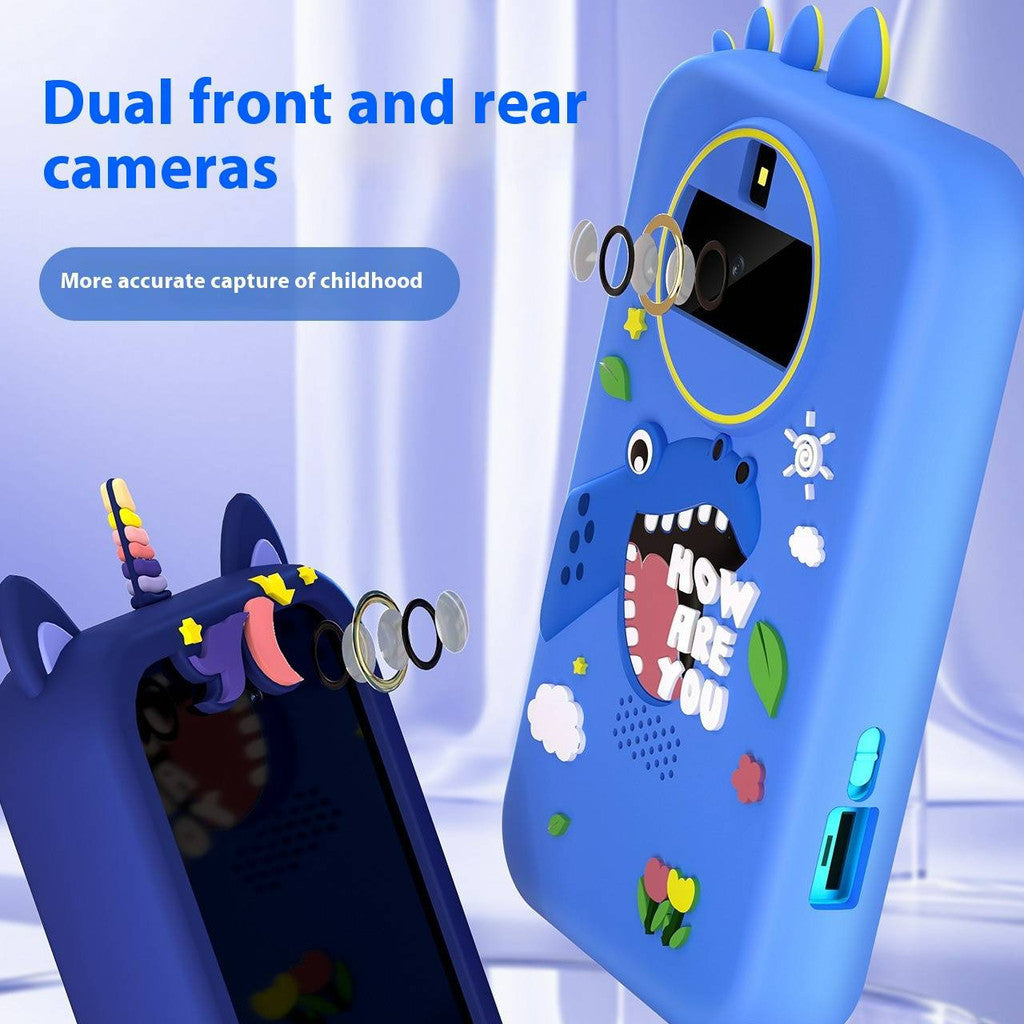 Kids smartphone camera, this is a 2.4-inch touch screen device. The front and rear dual-camera 30w cameras greatly improve the clarity of photos. Kids can use photo stickers to take photos and share the fun with family and friends.