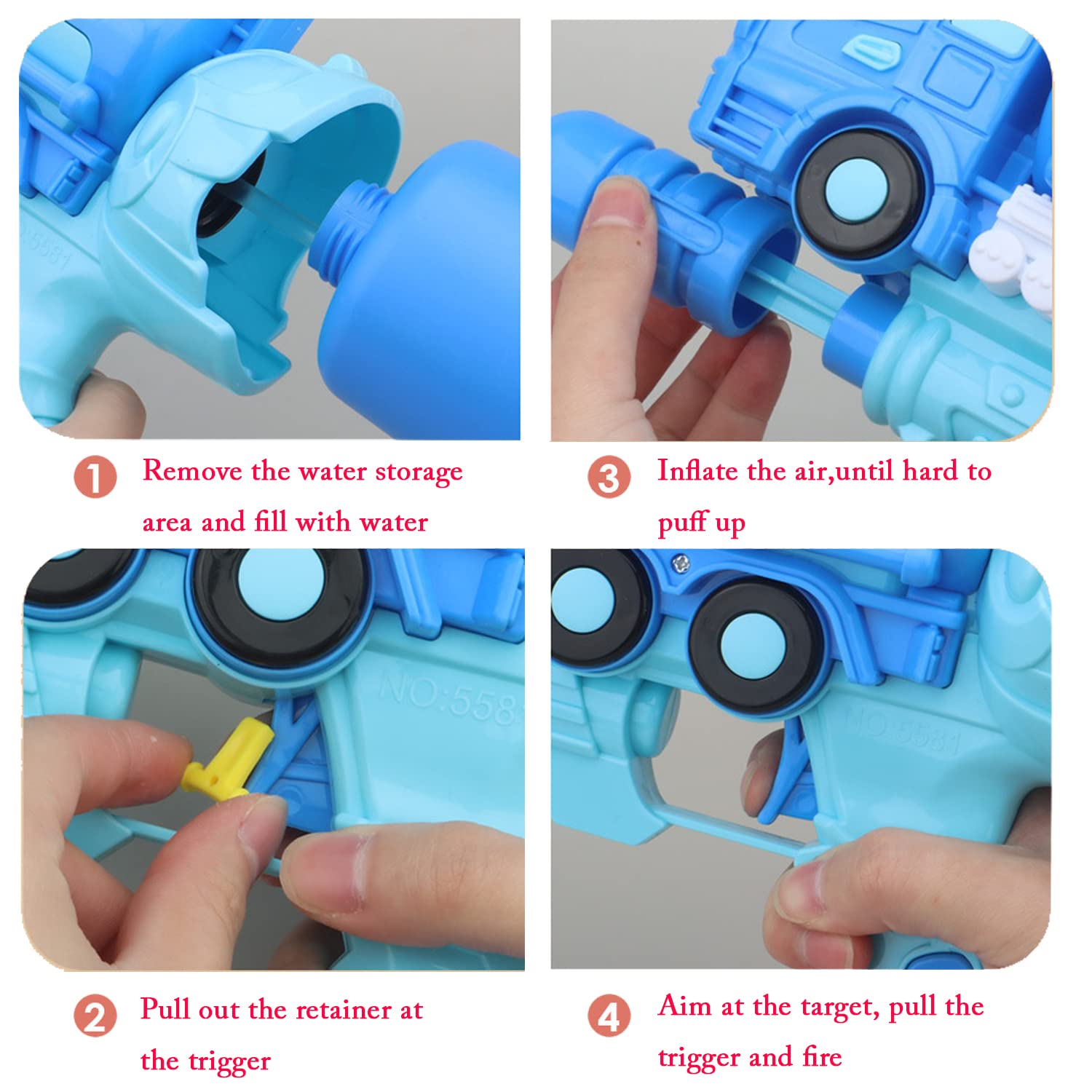 - Fill the water water, after closing, it is tightly sealed and no leakage, press the trigger, easy to shoot, suitable for water fights and family entertainment, adults can accompany children to spend a happy time.