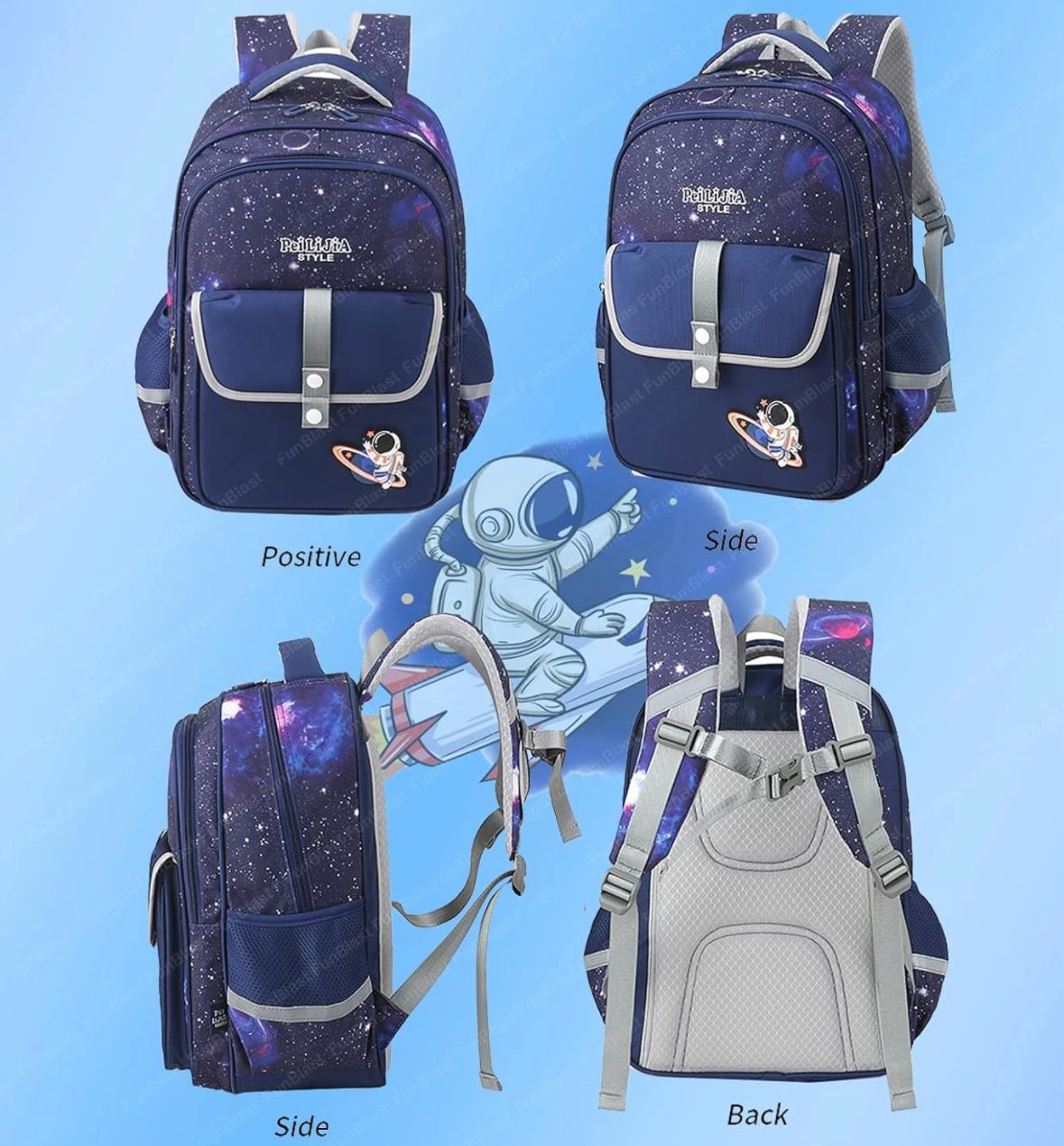 • Adorable Space Design with 1 Main Big Pocket, 1 Semi Pocket and 1 Front Flip with 2 Bottle Space, Amazing Breathable Backside and Shoulder Straps for Extra Comfort