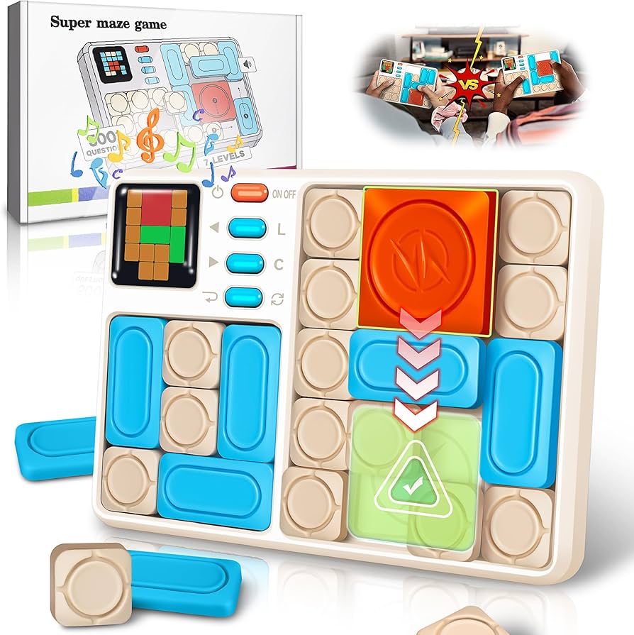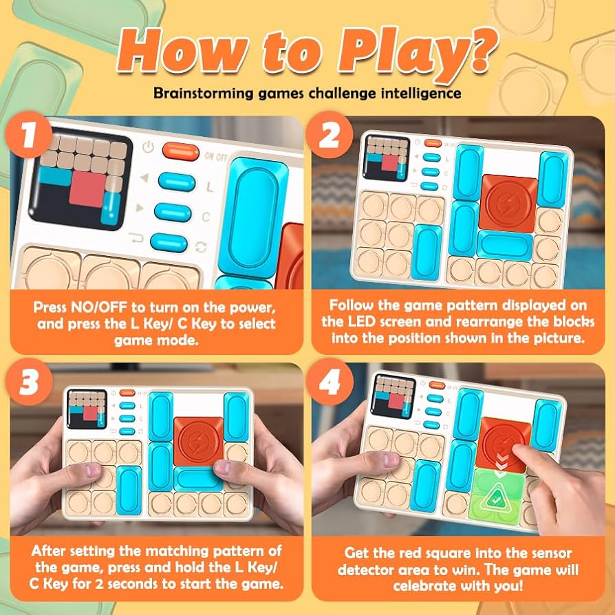 - Super Slide Puzzle Games: This travel games comes with 500+ different puzzles with gradually increasing difficulty. Children can exercise their brains and thinking while having fun. Just follow the instructions on the screen, place the bricks, start the game, move the red bricks to the designated sensing position, and the challenge is successful. You cannot pick up the bricks during the challenge.
