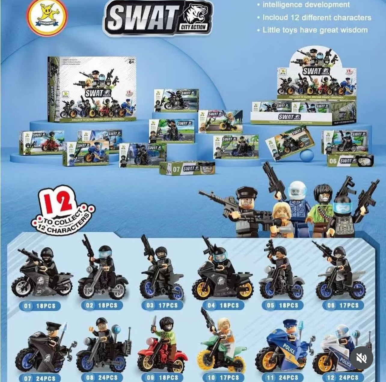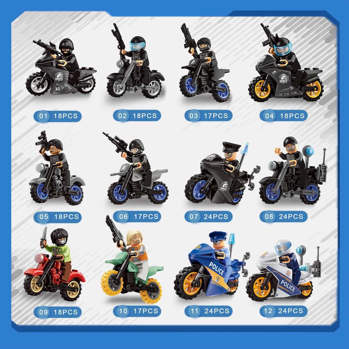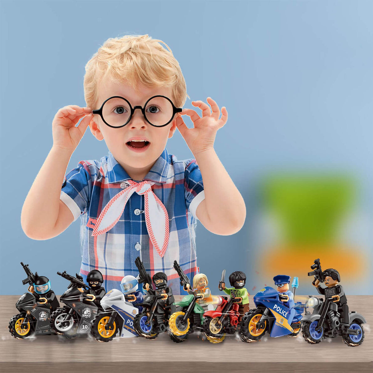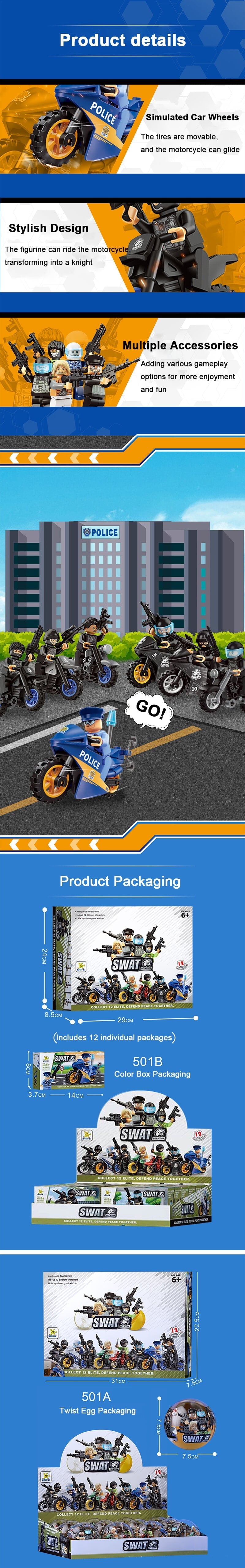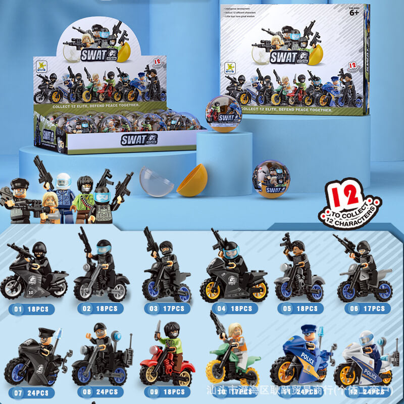 This children's educational toy is a combination of a motorcycle figurine and building blocks, accompanied by a twist egg blind box. The motorcycle figurine features realistic design, with movable tires and space for placing figurines inside.
