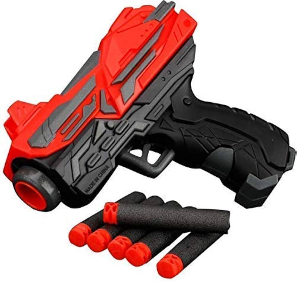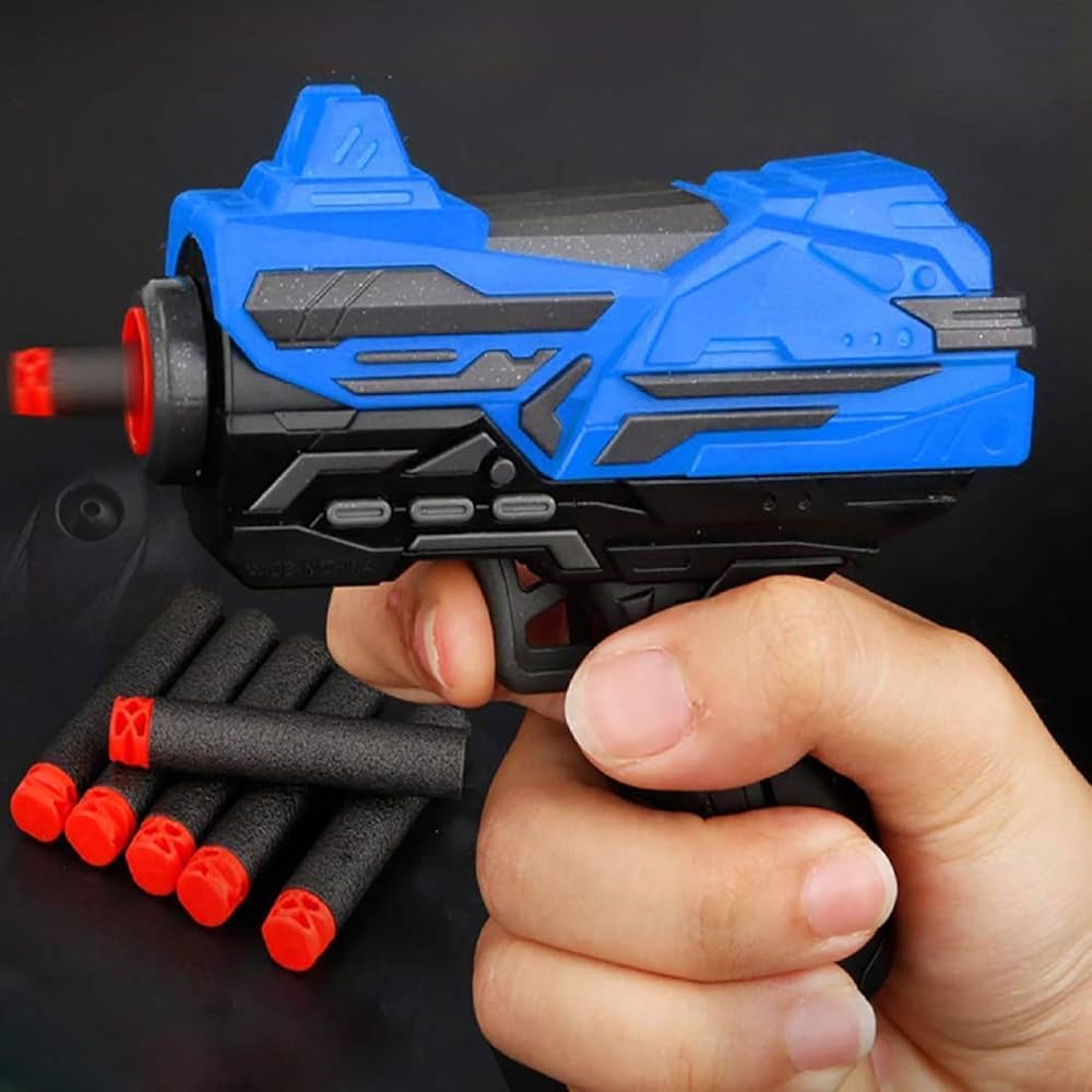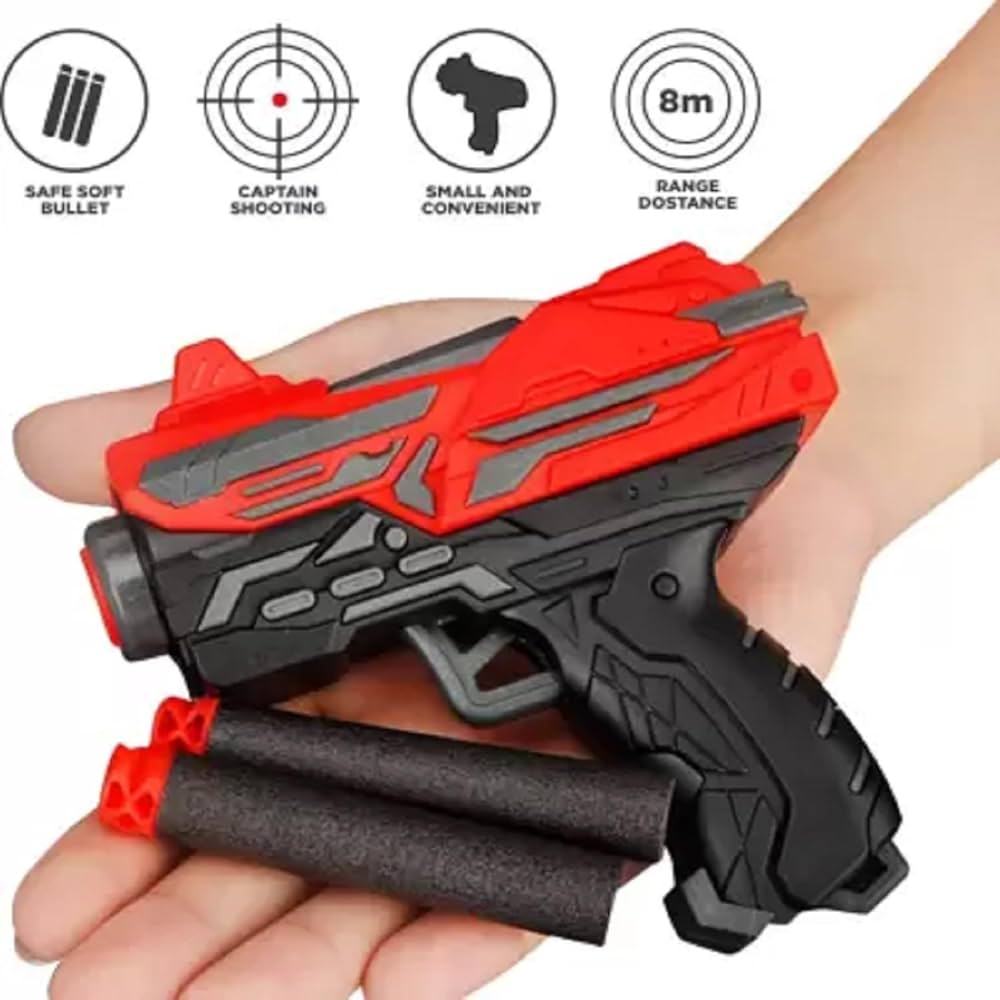 - DESIGN: The toy pistol gun is specially designed for kids keeping their safety in mind. It includes 14 soft bullets. The soft bullet range is 30 FT with harmless impact. Suitable for kids above 6 years of age
